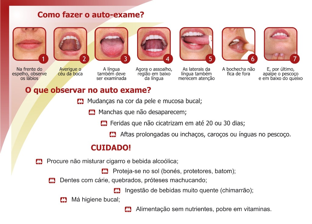 Nem sempre é possível visualizar os primeiros sinais que indicam a existência do câncer bucal, o que aumenta a importância das consultas regulares com o dentista ou o médico. Seu dentista foi preparado para detectar os primeiros sinais do câncer bucal. Contudo, além das consultas regulares, é preciso que você fale com seu dentista se perceber qualquer dos sinais abaixo:
